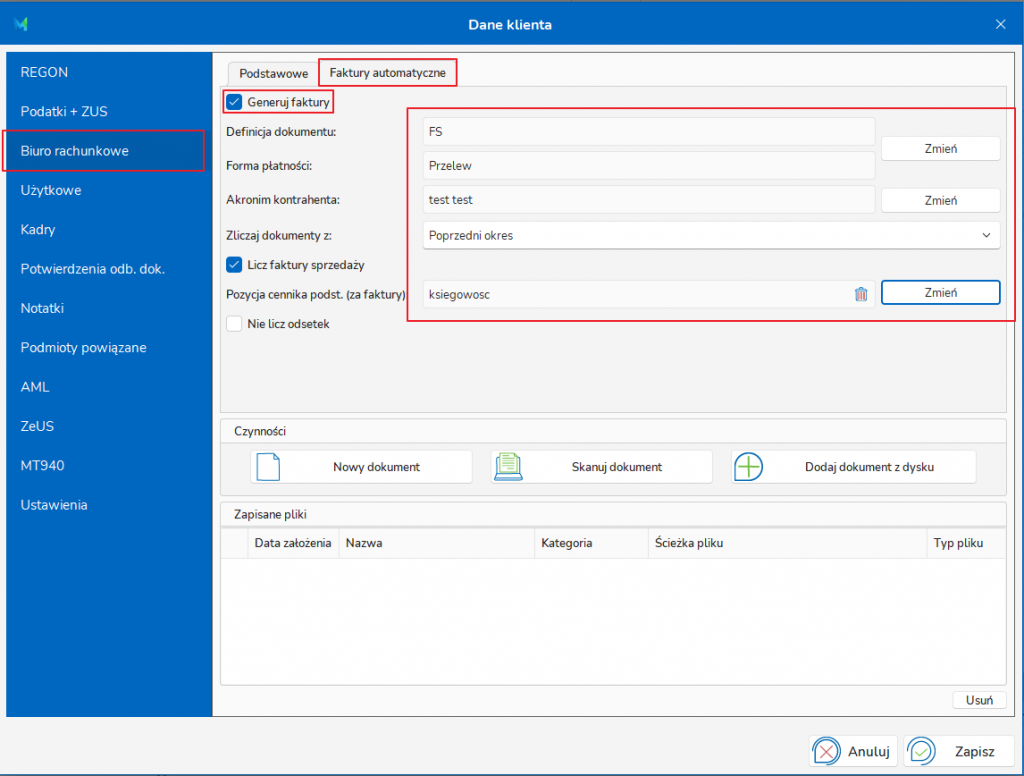 2. W teczkach klientów w Biuro Rachunkowe należy w zakładce Faktury automatyczne zaznaczyć opcję Generuj faktury a także skonfigurować pozostałe dane.