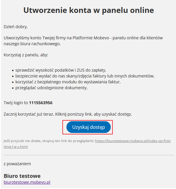 Po otrzymaniu maila kliknij w przycisk Uzyskaj dostęp, a zostaniesz przekierowany na stronę Panelu Online Biura Rachunkowego.