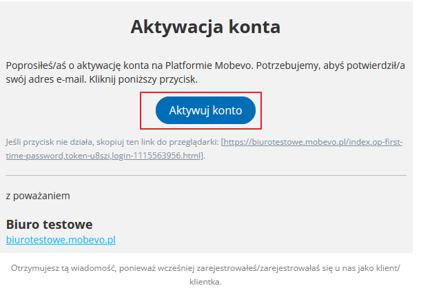 Kliknij w przycisk Aktywuj konto, po czym zostaniesz przeniesiony ponownie na stronę panelu biura, jest to rodzaj weryfikacji dwuetapowej, aby potwierdzić adres mailowy.